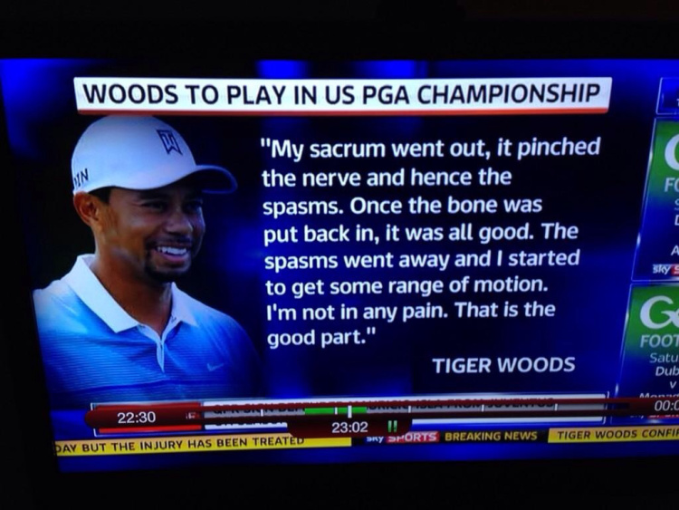 Around the middle of this year Tiger woods was about to embark on a PGA tour championship. Tiger had been recovering from back surgery back in March and had made what appeared to be a speedy recovery. Posting on his website he released a statement to the press about treatment he had received from his medical team regarding back pain. This was apparently unrelated to his surgery. Tiger used some very explicit words to describe what happened to his back, specifically his sacrum. The language that used can give the reader the impression that the sacro-iliac joint is a vulnerable joint and that it can be clicked back into place. Hopefully this has not created a wave Tiger Woods sacrum dysfunction amongst us! To know more read my post on this here. In order to understand why Tiger used these words we have to ask questions regarding the terminology the medical team is using. Tiger is a sports icon we relate to sports icons through the ways they inspire us and motivate us and even influence our behavior. Just to highlight there are numerous studies out there that have shown that the sacrum has a minimal amount of movement but it can be a potential source of symptoms (reference, reference, reference, reference).