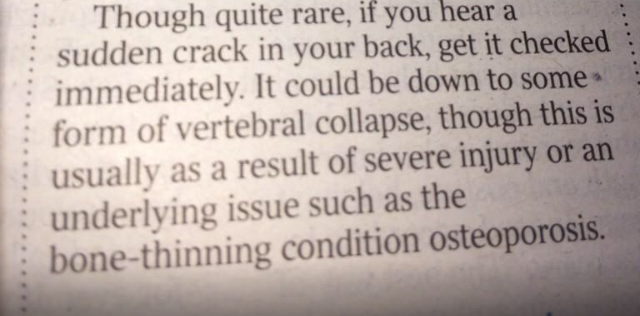 This first example for me is particularly damaging! I experiences cracks all over my body and there can be any number of explanations for them. The message I get from this very clearly is that every time I hear a crack in my back I should either go straight to my doctor or better still go to A&E because I may have suffered a vertebral collapse which infers I have sustained a fracture!! I’m going out on a limb here but…..
