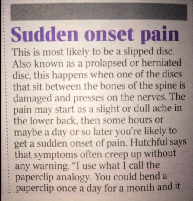 Another example explains that a sudden onset of pain is most likely a slipped disc. First of all discs do not slip! Secondly, I can’t see how this would be the case as it suggests that your discs are the cause of back pain. As previously mentioned there is minimal correlation of MRI findings that a disc injury is a predictor of pain. There are several structures in your back that have a nerve supply, ligaments, muscles, fascia, joint capsule, nerves themselves. The disc has a nerve supply too but you cannot relate this to being the main cause of a sudden bout of back pain. A more rational explanation for this would be - “a sudden onset of pain can be very distressing and at times disabling for the sufferer. However if you are normally fit and of good health with no co-morbidities it is likely to be nothing too serious. There are a number of immediate things that you can do to help yourself…………………” Can you see how this creates reassurance for the sufferer?![IMG_4639[1]](../../../../2014/11/img_46391-e1414719045652_w-376-h-390.png)