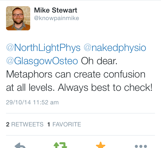 First of all I would never tell my patients any of the above! Clinicians use metaphors and language everyday to try to explain, in simple ways how we can understand what might be going on in terms of our injury. Some of the language and metaphors used can be a helpful, others quite the opposite being a hindrance. The issue with language and metaphors is that we can take them so very literally. Clinicians first rule is ‘to do no harm’ but sometimes our language use can cause real problems for patients and clinicians may not even realize it.