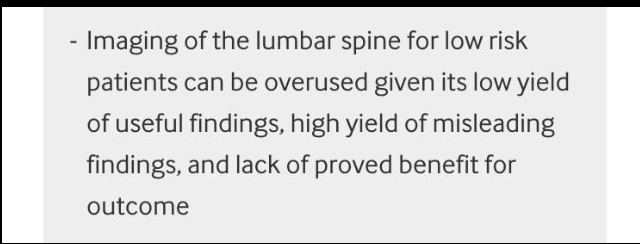 THIS IS SIMPLY NOT TRUE! The evidence suggests that only 1 to 2% of people presenting with LBP will have a serious or systemic disorder. The best predictors of fracture are the presence or cluster of a history of severe traumatic injury, the presence of abrasions or contusions (bruises), prior to corticosteroid use and being a woman over 74 years of age (reference).