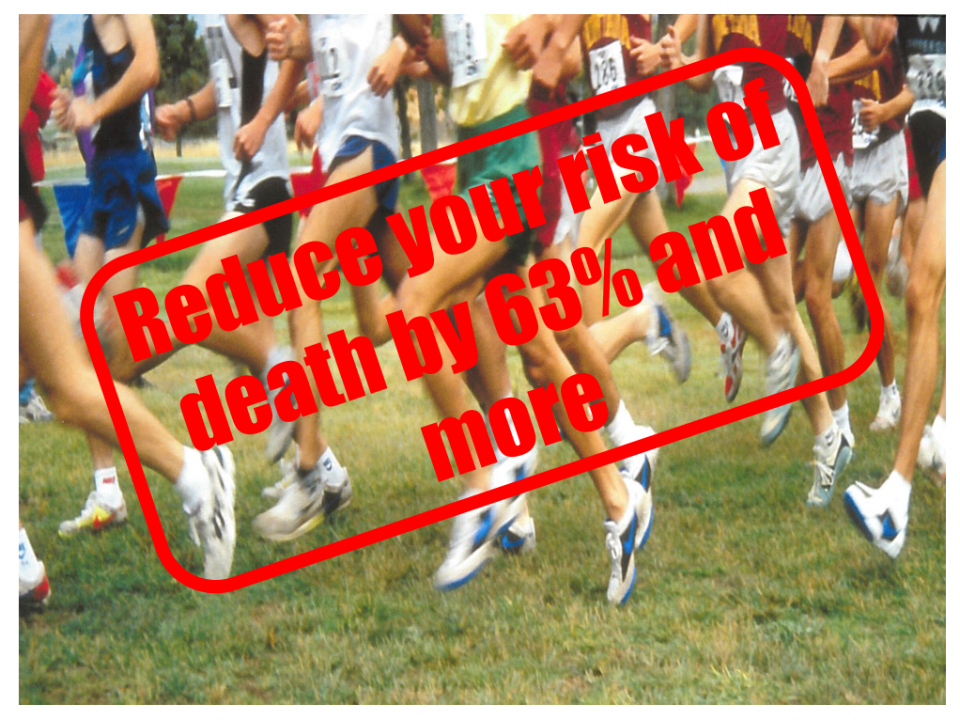 That’s a huge percentage! Yes, according to recent evidence (Artero et al., 2012) running really does reduce the risk of death by 63%! As the title suggests this relates to cardiovascular disease and all-cause mortality (cause of death), which includes other chronic conditions such as obesity, diabetes and cancer. Lee et al (2014) identified that running less than 51 minutes a week decreased your risk of developing heart disease by 45% and all-cause mortality by 30% and persistent runners had the most significant benefits, with 29% and 50% lower risks of all-cause and cardiovascular mortality, respectively. 51 minutes a week! That’s less than 10 minutes a day and for the cost of a pair of running shoes, that’s an amazing deal and a cheap way to exercise! A more recent study by Hupin et al., (2015) found that moderate to vigorous activity in age groups of over 60 reduced all-cause mortality by 22%. So it’s good to start anytime.