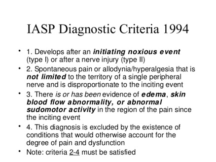 There are a specific set of criteria to help to ascertain if someone has CRPS, called the Budapest criteria, it was developed by the International Association for the Study of Pain (IASP) and is an update to the old criteria developed by Merskey & Bogduk (Eds), (1994).