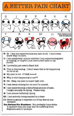 I use this scale to inject a bit of humour into the session because we all know laughter is the best medicine. Once the patient and I begin to see an improvement in their self-reported pain (which may take some time) I use pain scales less and less.