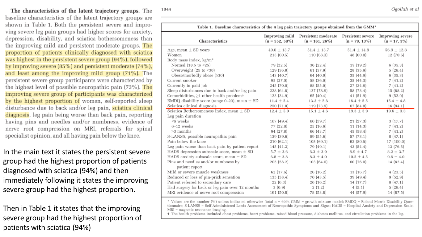 Ogollah and colleagues used the data from a cohort of 609 patients from the Assessment and Treatment of Leg pain Associated with the Spine (ATLAS) trial (Konstantinou et al., 2012, 2018; Konstantinou, Dunn, Ogollah, Vogel, & Hay, 2015)and something called Growth Mixture Modeling (GMM) to identify clusters of patients with distinct leg pain trajectories.
