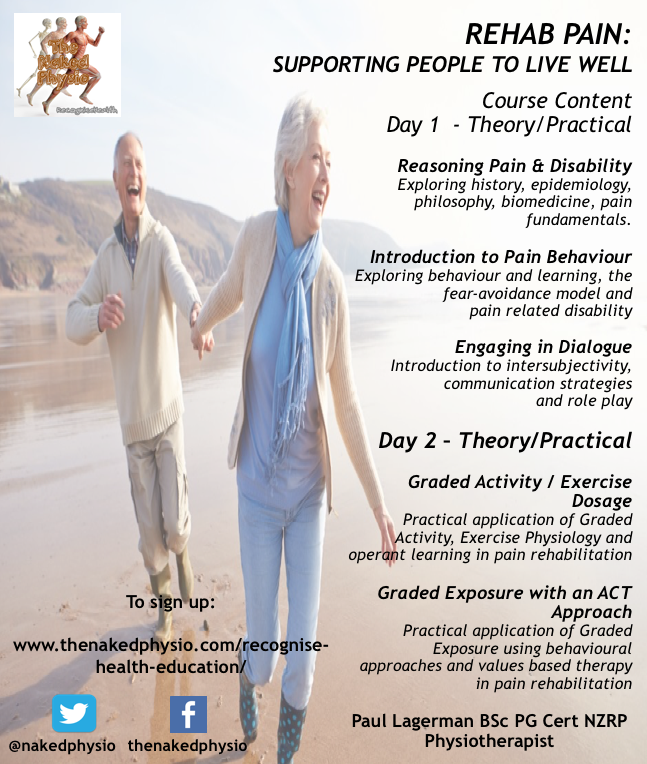 Rehab Pain focuses on two major components that are lacking in the delivery of pain management – understanding pain behaviour and clinician behaviour when working with people living with pain . This course will explore some of the shortcomings of biomedical treatment, pain behaviour, biobehavioural physiology, practical application of graded activity and graded exposure with a values based approach, reasoning and critical thinking skills using a variety of role play examples including CRPS, LBP and complex physiological presentations. By the end of the course clinicians will aim to a better understanding of the following areas: